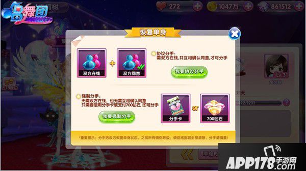 已经结缘成功的小伙伴,如果需要恢复单身或者换个伴侣的话,那么同样在幸福树中实现哦,有“协议分手”和“强制分手”2种方式选择。