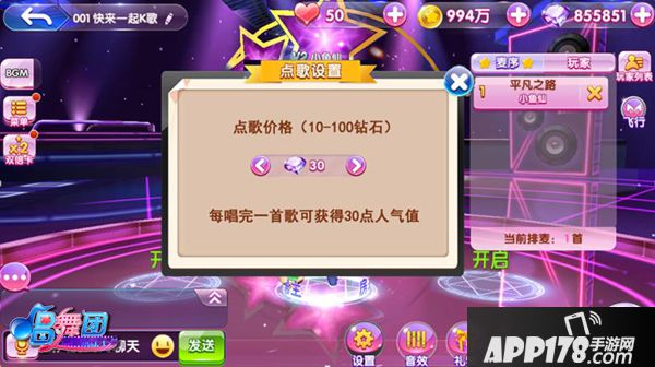 其他的小伙伴进入主播房间,可以点歌请主播来演唱哦!不过主播唱的也很幸苦,所以点歌是要付点钻石的哦……当然演唱歌曲后,主播可以获得对应钻石的人气值。当主播新秀的粉丝超过5000,或人气达到20000时,可升级达人主播。