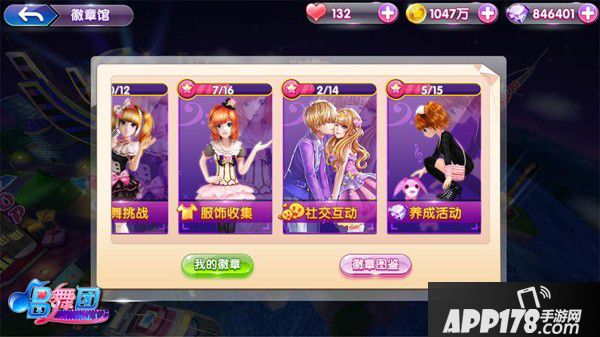 唱舞团中的徽章分为4个类型:唱舞挑战、服装收集、社交互动、养成活动共有57个徽章。根据完成目标的难易,徽章也分为普通和高级,高级的徽章可是会动的哦!