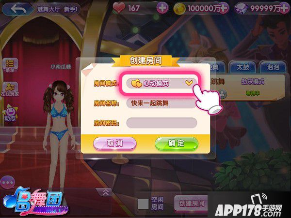 在魅舞大厅点击创建房间,在【房间模式】下拉菜单中选中“心动模式”确认创建,即可开启心动模式的游戏