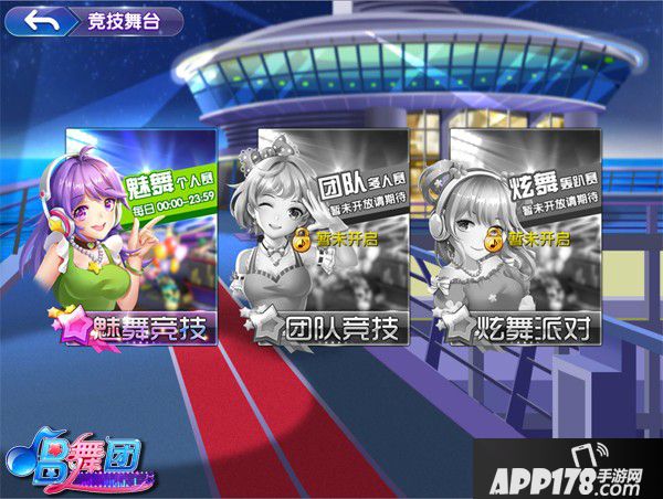 竞技舞台中包含:魅舞个人赛、团队多人赛、炫舞轰趴赛;只是目前仅魅舞个人赛是开放的,其他2个竞技赛事,我们的技术员小哥们还在努力开发ING,小伙伴们可以留意后续版本哦。点击【魅舞个人赛】进入游戏吧!