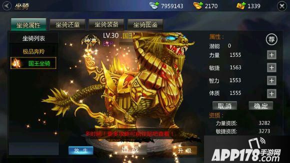 4、坐骑装备升级需要消耗一定的多余坐骑装备,请在升级坐骑装备时谨慎选择。