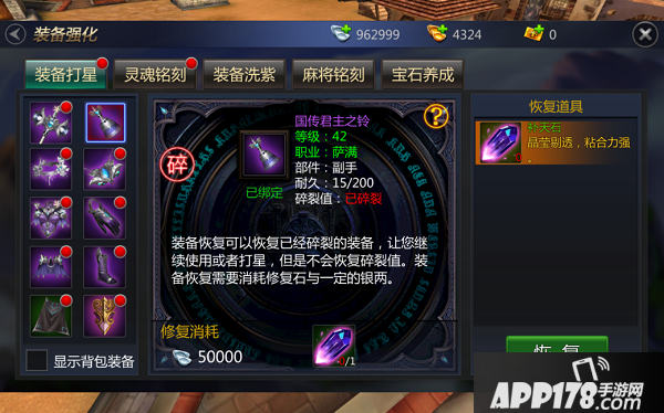 特别需要注意的一点是,每件装备都有碎裂值,当升星失败时,碎裂值将会降低,当碎裂值为零后,再次升星失败,装备将会彻底损坏,无法进行穿戴或提供属性加成。为了防止装备碎裂,可在使用保护道具的情况下进行升星,这样将可避免装备损坏,如果装备彻底损坏后也可通过补天石进行恢复。