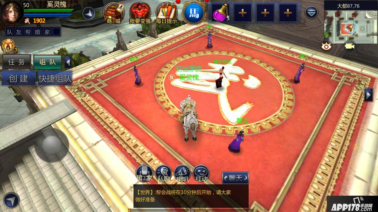 2、每晚23:00舞厅开放,开放后进入舞厅并使用舞厅内的离线挂机,将会获得高额经验奖励、声望、威望奖励。