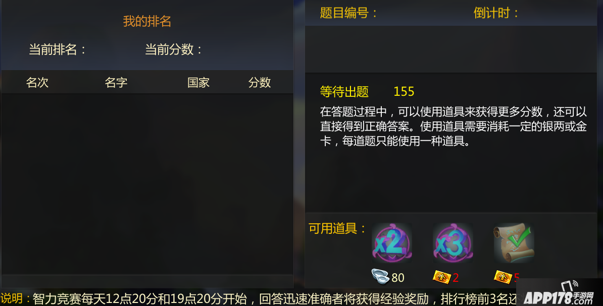 4、答题结束时,分数排名前三的玩家,将会获得额外奖励。