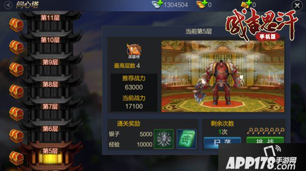 问心塔为单人闯关模式,每通关一层都会获得相应奖励,每层一个BOSS,层数越高怪物能力越强。