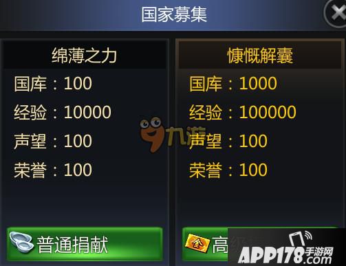 国家募集,可以想象成国家的财务来源。(有了财力,才可能招兵买马,武侵他国)。国家募集由本国玩家自主参与,玩家可选择使用不同货币进行捐献,但每位玩家每天可捐献三次。捐献成功的玩家可获得丰厚的奖励,也会为国家增加资金。