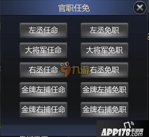 官员:国王当选后,有任命全国官员的权限。王后为本国国王的配偶担任(所以,游戏会有结婚系统?),大将军、左丞相、右丞相均由国王直接任免。而充当帝王保镖的金牌左捕、金牌右捕将由大将军任免。(所以,大将军的职位,必须由国王的心腹担任!)。各职位均非空衔,都有自己的官务,当然,也有俸禄。