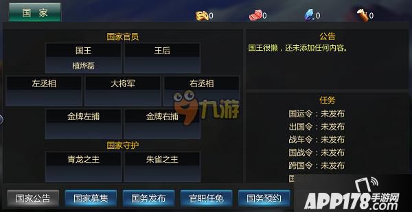 如果国民不愿缴纳,那么当本国资金不足时,将无法开启国务,也就无法开启国家征战,国家探宝等大团体活动。这里仅列举三处国务玩法:国运、出国征讨、国家探宝。