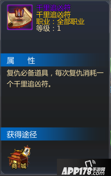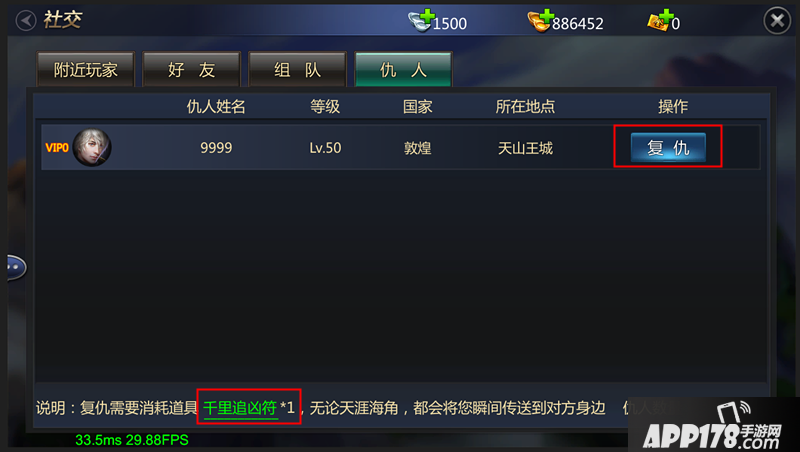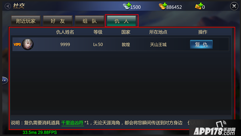 复仇功能:选择“仇人”玩家,并点击“复仇”功能键即可传送至该玩家附近。复仇需要消耗“千里追凶符”,道具可通过“商城”或其他玩法获得。