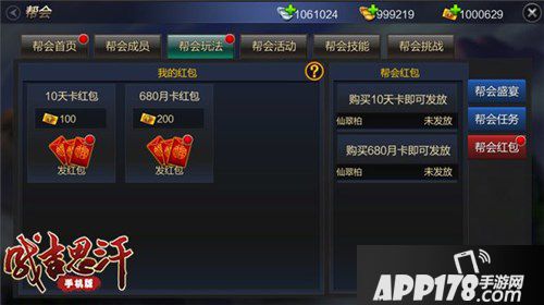 帮会帮主可发起帮会任务,参与任务、玩法的帮会成员人数,将决定完成后的奖励收益。每日完成帮会任务、活动及帮会战胜利与失败的次数,将影响本帮成员当周的帮会津贴奖励。此外还有帮会红包功能,购买月卡可向帮会成员发红包,每个红包由20位帮会成员来抢,金额随机。
