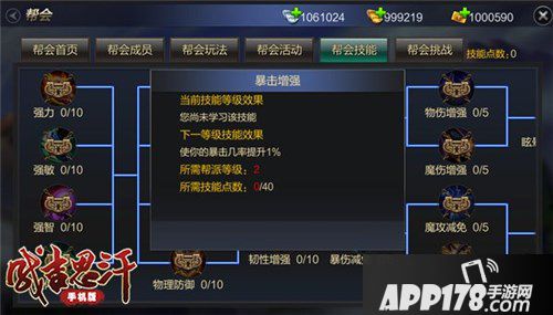 随着帮派级别的提升将解锁帮会技能,帮会技能将提升玩家属性,对战力提升非常显著。