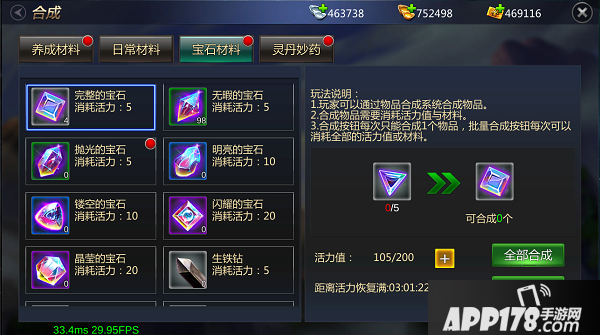 如果大家背包中的低等级宝石较多的话,可以点击界面右下方的合成按键即可进行宝石合成操作,每5颗低级宝石都可合成一颗高级宝石,合成宝石会消耗一定活力值。