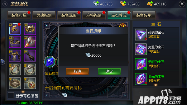 当然,随着大家等级的提升与物品的丰富,初始镶嵌在装备中的宝石属性可能已经无法满足现状,这时大家可以点击孔位内的宝石即会弹出是否拆卸宝石的提示框,只需消耗一定数量的银子即可进行拆卸。