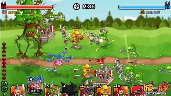 《城与龙》基本玩法就是要比对手更快速的贡献城池,玩家进入游戏前可以根据战斗均衡选择怪物,怪物又分为进击和迎击两种。进入游戏后,屏幕左方有一排10个的召唤珠,每召唤一个宠物需要消耗指定数量的召唤珠。召唤行为必须在召唤区间线左边。玩家可以通过攻陷中立小城堡,拓展占领的召唤范围,场地的优势会让你能更快速的攻击到敌人哦。