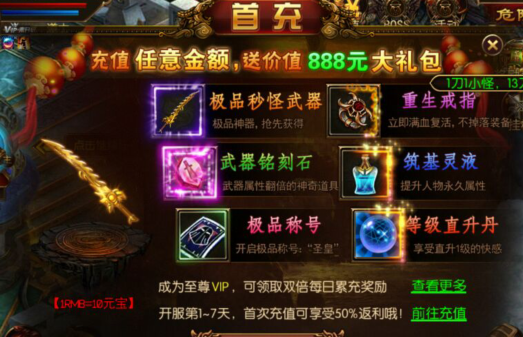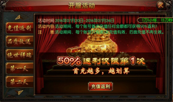 充值返利:首次充值元宝,即可返还充值元宝的50%。首充越多越划算!