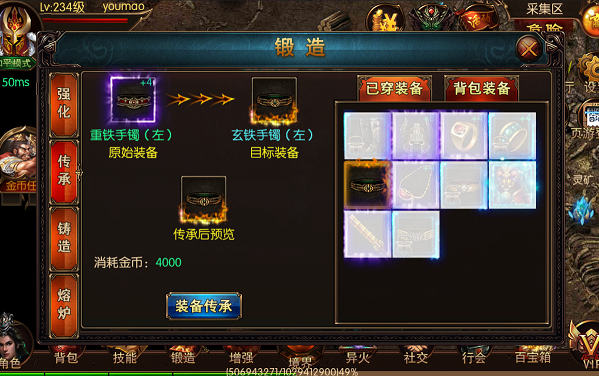step 3、点击“装备传承”,一键强化