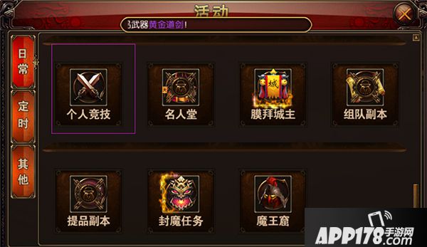 个人竞技的玩法有两种。一种玩法是挑战其他玩家。游戏依据玩家战斗力排名从高到低排序,玩家可以根据随意选择。PK时间设置一分钟,大部分玩家都在几十秒内结束PK。PK失败的玩家,可获取经验值80000和荣誉值10,同时排名不变。PK获胜的玩家,也是获得经验值80000和荣誉值10,但是排名可以提升一位。每日玩家可以挑战5次,每次之间的冷却时间为10分钟。
