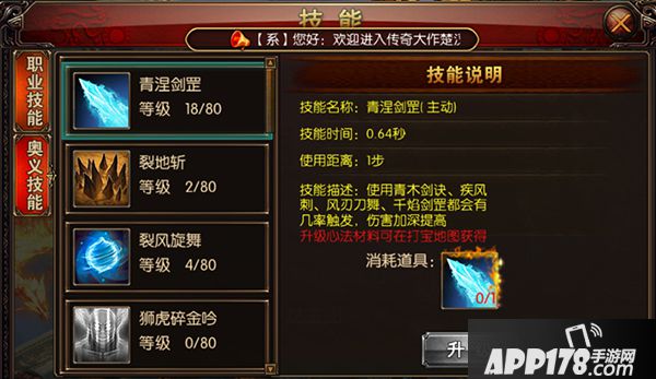 技能描述:开启后,对正前方1-2格目标造成伤害,并忽略第二个目标防御。对于此技能使用,玩家可以保持与目标一定距离。对应的奥义技能:裂地斩。升级心法材料可在打包地图中获得。