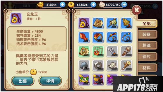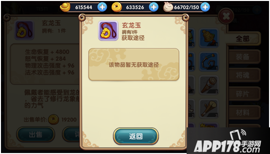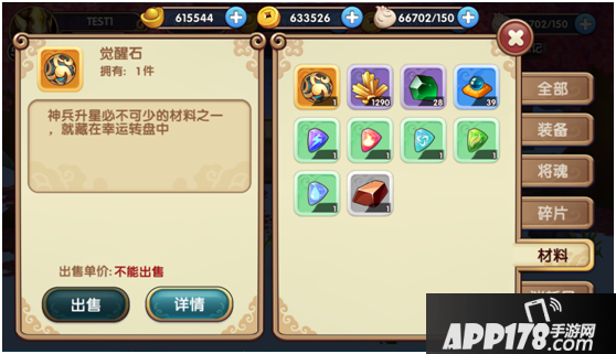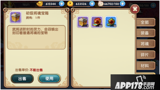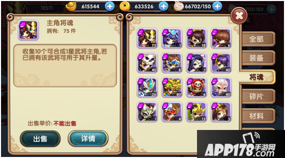 仓库中设置了几种分类,可以进行快速查询,将魂界面收集了所有的武将将魂碎片。将会碎片无法进行售卖。