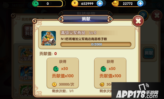 这就是军团捐献的界面,捐献可以获取“义军勋章”,可以在商店兑换道具。