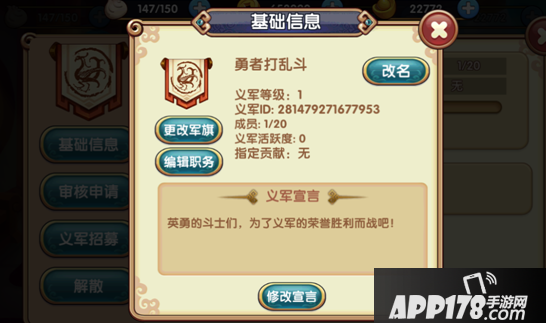 第一步当然是创建好军团咯,军团的建立是需要花费100元宝的。起始基金还是很合理的,可以选择自己的军团团徽,创建好军团名称,以及军团宣言。当然也可以加入其他玩家的军团一起征战哦!
