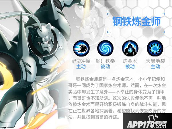 背景:钢铁炼金师原是一名炼金天才,小小年纪便和哥哥一同成为了国家炼金术师。然而,在一次炼金实验中却发生了意外——不幸让的身体变为了铠甲,而哥哥也不知所踪。这次的失败使他不再一味地依赖炼金术而是开始积极锻炼自身的战斗技能,现在正在世界各地探索着,希望能找到恢复肉身的方法,并且找到哥哥的行踪。