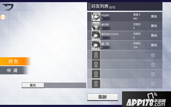 在好友系统中可看到好友列表和申请、查找添加、删除四个功能,还可以查看到在线好友与当前好友数量。