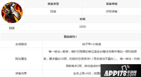 日炎是一件极具进攻性的防御装备,本身2000的价格能提供500的血量和50护甲,属性中规中矩。但是自带的附加被动“献祭”是这个装备的灵魂。它会对周围的敌方单位每秒造成魔法伤害,并且你靠近一个敌人越久,他收到的被动伤害就越高。所有的肉盾型英雄都可以选择这件装备。