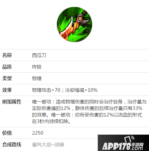西瓜刀这件物理装备,重在物理攻击和吸血属性。比起其他物理属性装备来说,西瓜刀的吸血有所不同,他是次元目前唯一一个物理“伤害”可以造成吸血的装备。也就是说,所有的物理伤害技能,也能获得吸血属性,配合冷却缩减,让很多以物理技能为主要伤害的英雄非常受益。他的另一个被动,能延缓部分伤害的到来,让很多英雄在收到伤害后,有一定的反应时间来通过生命回复或者吸血抵消这部分伤害,防止被秒。