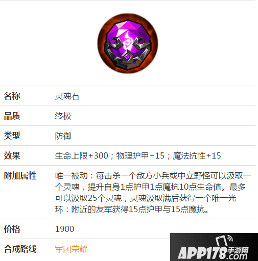 灵魂石这件装备是一件团队型防御装备,对于装备持有者自身来说,很多玩家单看基本属性会感觉很低,其实他的属性加成很全面,有面板的300血量和15双抗,“灵魂汲取”的被动叠满后,还能额外获得250血量和25的双抗。更不为人知的一点是,如果你的被动叠满,产生的光环,不光队友受益,自身也能享受这个buff。总的来算,这件装备能给装备者本身提供一共550血量,55点双抗!加上团队光环则更加强大。