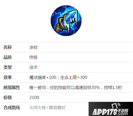 冰杖这件装备的属性,是所有法系装备中较为特殊的。它的被动让法师的所有技能拥有了“减速”这个控制能力。并且,这个减速配合很多技能自身的减速效果,让敌人更难移动。100的法术强度和300的生命上限,也给很多法师英雄们提供了一定的生存能力。