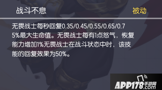 无畏战士(以下简称无畏)是一个自带无限火力被动和超强生命力回复的坦克型英雄。他的技能是无消耗的,还可以获得怒气,怒气让他获得额外的技能伤害和生命回复,前期可以一打多,有了大招就可以收割人头,1技能的移速也让无畏在生存上高出一个层次。所以这样一个又肉有又输出的英雄,完全可以利用自己的技术在低端局大杀四方,利用自己的发育能力在中高端局让对手无法撼动。