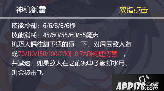 ①:机巧人偶的1技能神机御雷如果想要击飞敌方,需要普攻打出3技能被动破却水月,意味着机巧人偶在没有大招接近敌方时,很难在前期击飞敌方英雄。