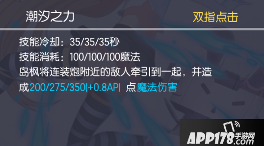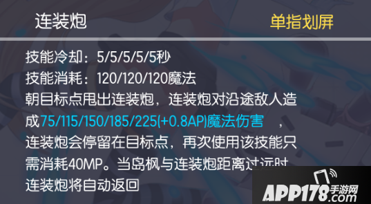 岛枫的技能说明她是一个发育能力非常强的英雄,她的1技能第一次使用消耗120蓝量,但是只要不回到身边,之后的消耗蓝量就只有40蓝,保证了前期蓝的用量;2技能疾风可以让她使用1技能命中敌方英雄时获得加速,保证了岛枫前期的生存,中后期的追杀能力;3技能水枪扫射让岛枫有了输出的能力,也让对线消耗和发育能力大幅度提升;4技能大招是保证了岛枫团控能力和团战的伤害,也让岛枫有了游走带节奏的资本。