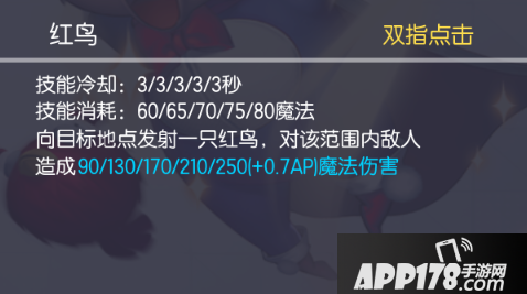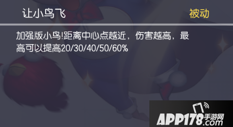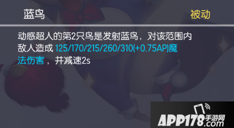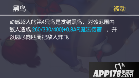 动感超人的技能说明他是一个发育能力和守塔能力非常突出的英雄,1技能(主动)丢出红鸟,范围伤害;2技能(被动)第二次丢的技能是蓝鸟,会有更高的伤害,同时附带减速效果;3技能(被动)距离中心点越高,技能会造成额外伤害,本身是AOE伤害技能,基础伤害和AP加成如此之高,还能造成额外伤害,可见动感超人伤害的恐怖;4技能(被动)第四次丢的是黑鸟,范围比之前大一倍,同时伤害和AP加成再度提高,同时附带高击退效果。