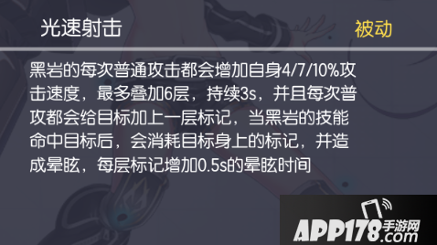 黑岩射手的技能说明她是不适合风筝牵制型的英雄,1技能(主动)直线伤害技能,射程远,射速快,伤害高,是对线消耗的主要技能;2技能(被动)近距离目标切换近战形态附带额外伤害和回蓝;3技能(主动)范围技能,有破甲和致盲的效果;4技能(被动)是黑岩射手的核心技能,普攻叠加攻速,同时附带标记,技能攻击带标记的目标则会眩晕。