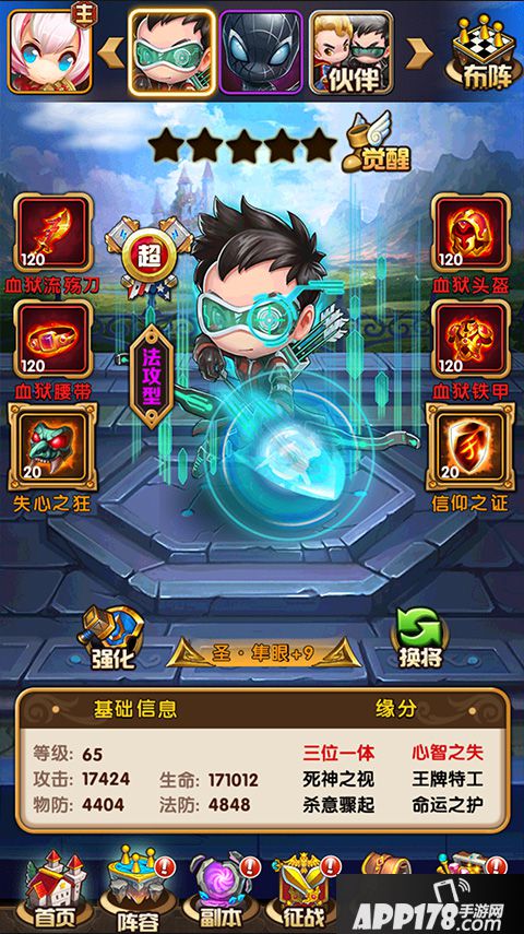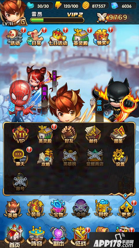游戏内所有玩法的入口都能在首页操作,包括对阵容的调整、副本、竞技场、装备等,下方第一排最右侧“更多”按钮中还有邮件、好友、聊天、英灵殿等功能。