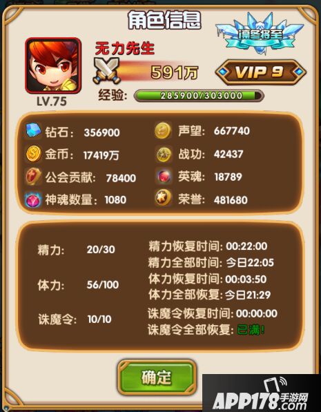 点击玩家头像后,可以查看精力、体力全部恢复时间。