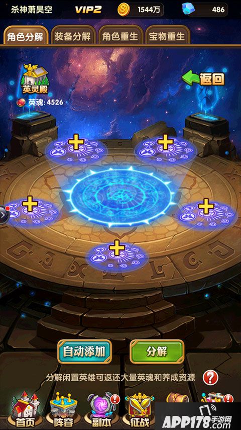 分解英雄可以获得金币和英魂奖励,英魂可在“英灵殿”中购买英雄碎片、培养剂、突破石等更多其他道具。