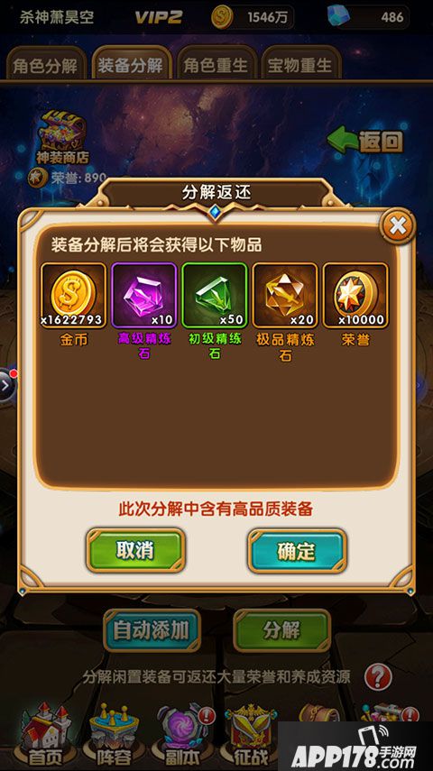 分解装备后可以获得金币和荣誉奖励,荣誉可以在“神装商店”中购买蓝、紫、橙色各装备碎片,宝物精炼石、装备精炼石等道具。如果被分解的是高阶武器(如图)还会额外返还一定量的装备精炼石。