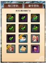 【签到】游戏鼓励玩家每天登录的一种机制,每天按时登录签到可以奖励各种游戏中的重要资源,涉及金钱、钻石、英雄经验、技能书、英雄碎片等物品。签到是不用连续的,中间间断了也可以继续领取奖励。特定的VIP等级可以领取双倍奖励哦。