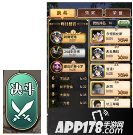 决斗页面中,会以玩家等级为基础,显示个人排名相近的玩家。玩家可以点击任意玩家进行挑战,胜出的话可以取代该玩家排名。领奖部分每天23:59结算,会根据玩家的排名派发奖品,玩家可以到领奖处领取奖品。决斗当中获得的荣誉,可以到决斗中的荣誉商店,换取各种角色碎片以及珍贵道具。