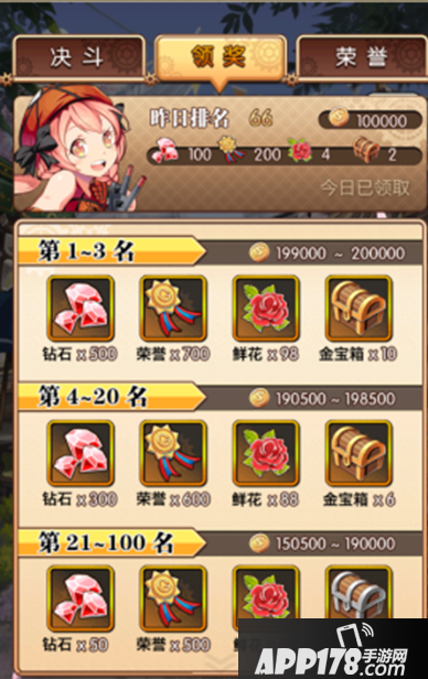决斗系统就是传统意义上的竞技场,玩家可以点击任意玩家进行挑战,胜出的话可以取代该玩家排名。在每天23:59结算后,会根据玩家的排名派发奖品,玩家可以到领奖处领取奖品。决斗当中获得的荣誉,可以到决斗中的荣誉商店,换取各种角色碎片以及珍贵道具。