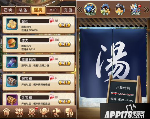 每日的体力的购买会严重影响你游戏的进度,由于每次购买体力的价钱都是一样的所以如果你每天可以比别人多买哪怕只有一到两次的体力,一段时间之后你们的差距就慢慢拉开了,因此在有了适当英雄后尽可能的多买体力,当然体力的购买次数和VIP等级有关。当然也有一些免费获取体力的办法,例如每天中午12:00-14:00,傍晚18:00-20:00都可以在探索界面通过泡温泉恢复体力。