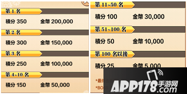 说的奖励总是我们最关心的问题,下面来看看奖励都有哪些哦,第一名积分350,金币200000;第二名积分300,金币150000;第三名积分250金币100000,第4-10名积分150,金币50000;第11-50名积分100,金币30000;第51-100名积分50,金币10000;100名往后积分25,金币5000。顺带说一下,最后一位击杀BOSS的额外获得积分200,金币100000,BOSS击杀时,获得双倍奖励。所以来的早不如来的巧,一切都看缘分。