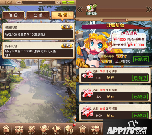 首次登陆有个七日签到礼包(里面共有600钻石和道具),还有正常的签到每月都有30天(共600钻石加各种道具)
