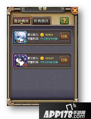 如果你有闲置的英雄,可以将其放入军营,之后你会有意想不到的额外收入哦!驻守的佣兵所获得的工资会根据该佣兵的等级,品级和驻守的时间来决定。