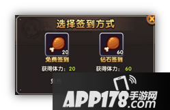 军团签到方式:免费签到获得体力值为20,钻石签到获得的体力值是免费体力值得3倍喽!快来体验用钻石购买体力吧!