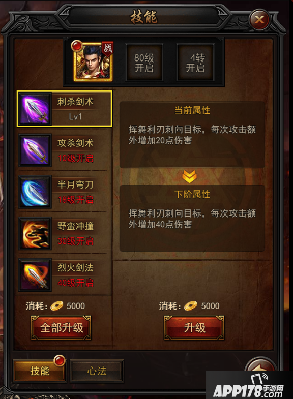 9、点击主界面技能按钮,进入技能管理界面,点击技能的图标可以升级技能。